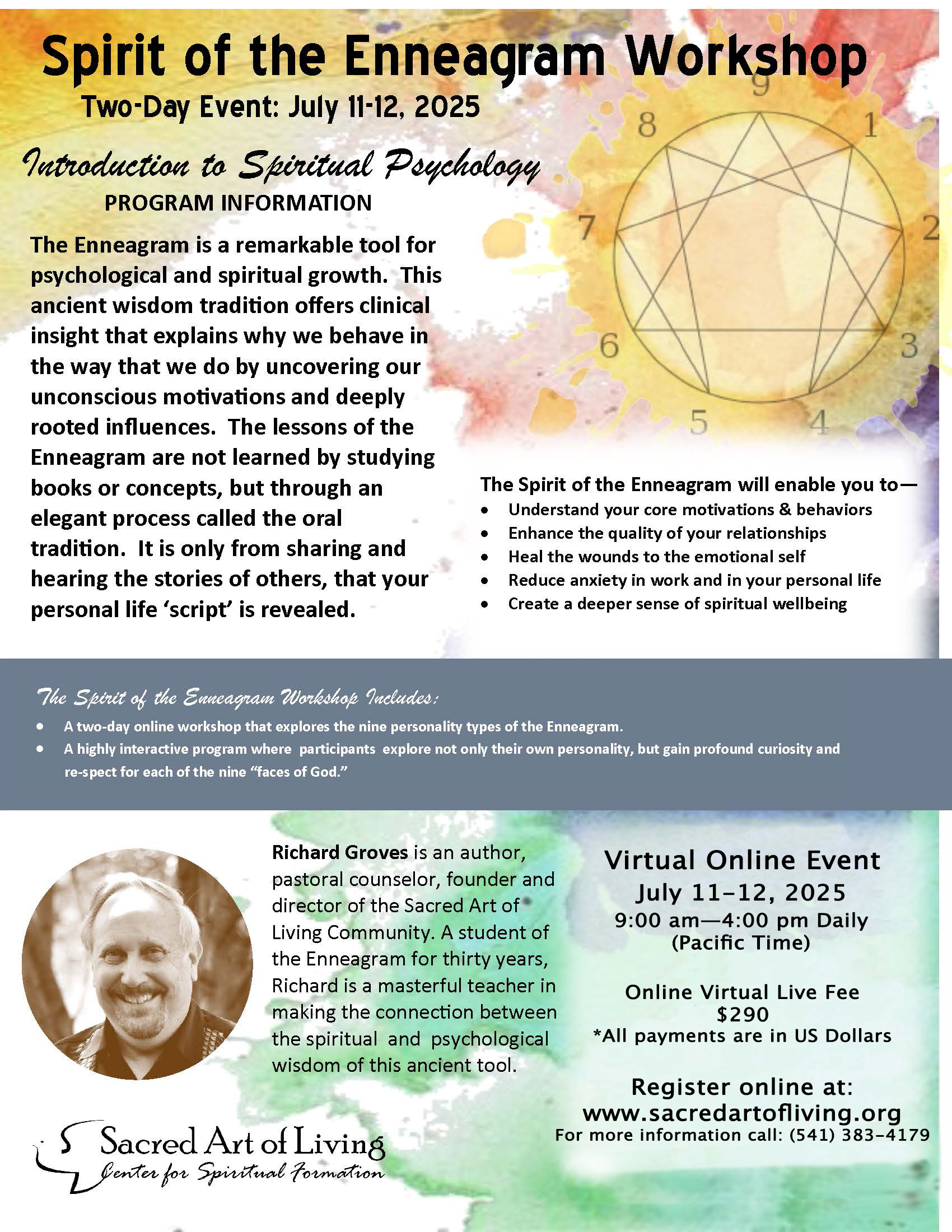 A complement and prerequisite for other Sacred Art of Living Center programs including— the Contemplative Enneagram Retreat and the Anamcara Project’s Apprenticeship program.